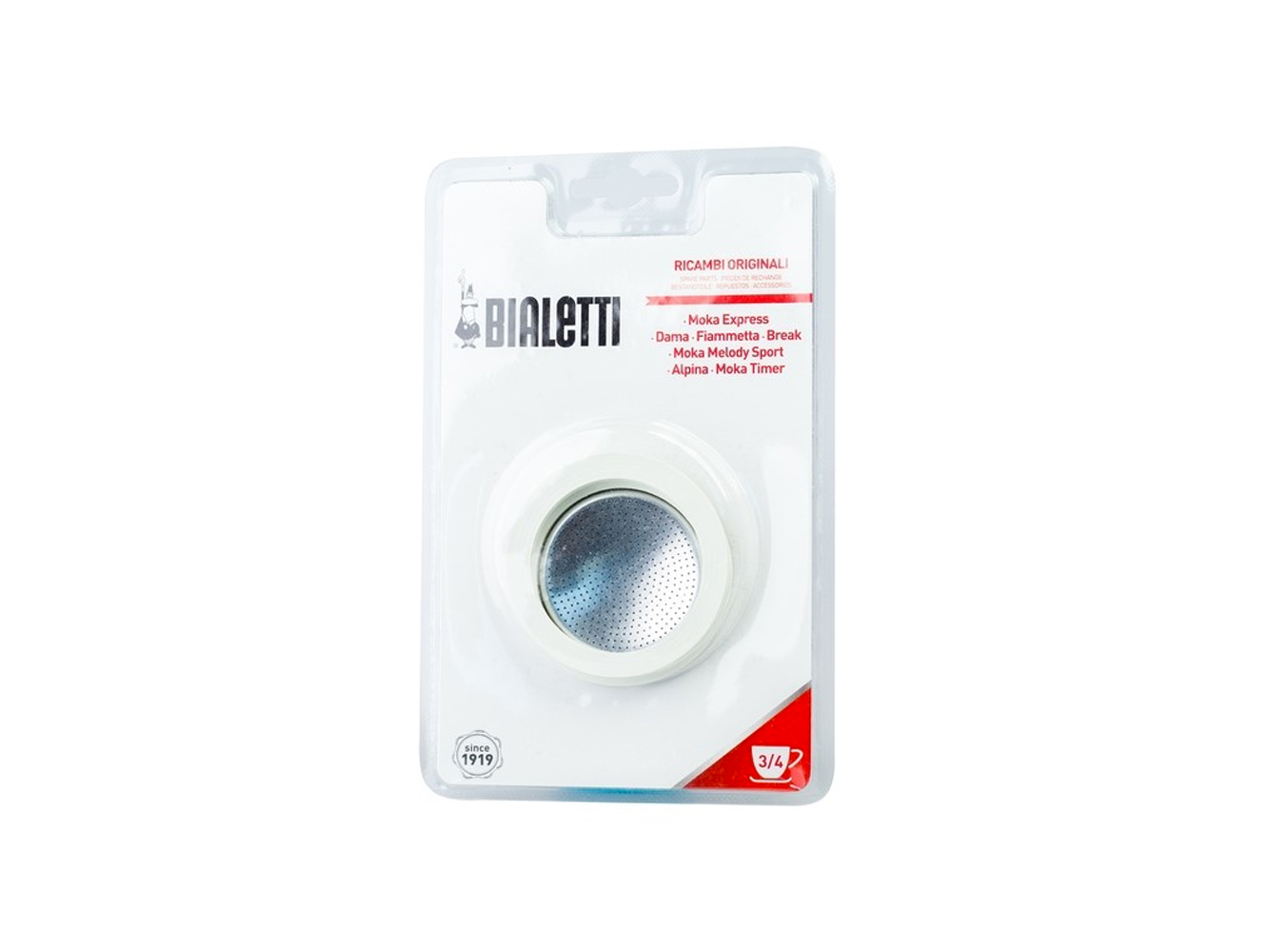 V balení naleznete náhradní nerezové sítko a 3 ks gumových těsnění pro všechny hliníkové Bialetti moka konvičky s velikostí na 2 šálky.